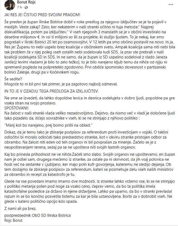 Odprto pismo Boruta Rojca, sina župana Ilirske Bistrice Emila Rojca, ki ga Tanja Fajon meče iz stranke SD. (vir: facebook)