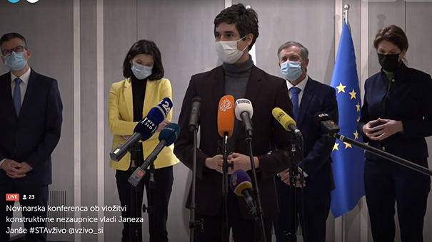 Liderji koalicije Kul s Karlom Erjavcem med včerajšnjo tiskovno konferenco ob vložitvi konstruktivne nezaupnice (vir: zaslonska slika iz neposrednega prenosa na spletni strani STA)